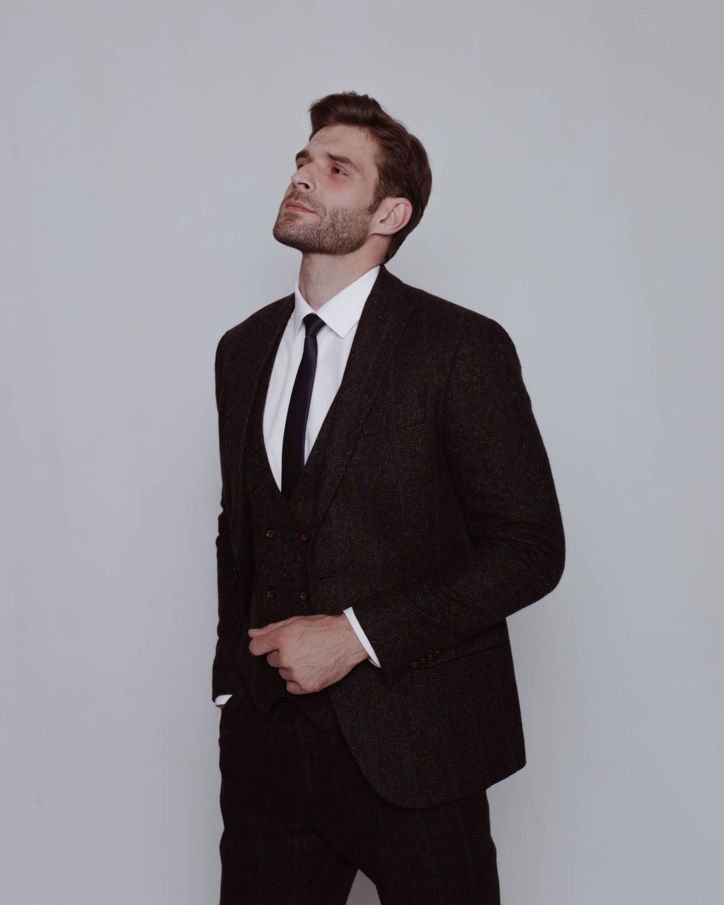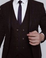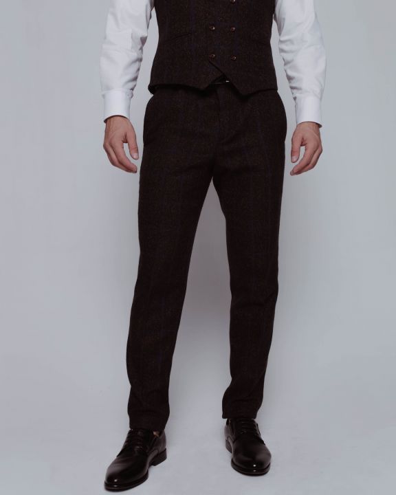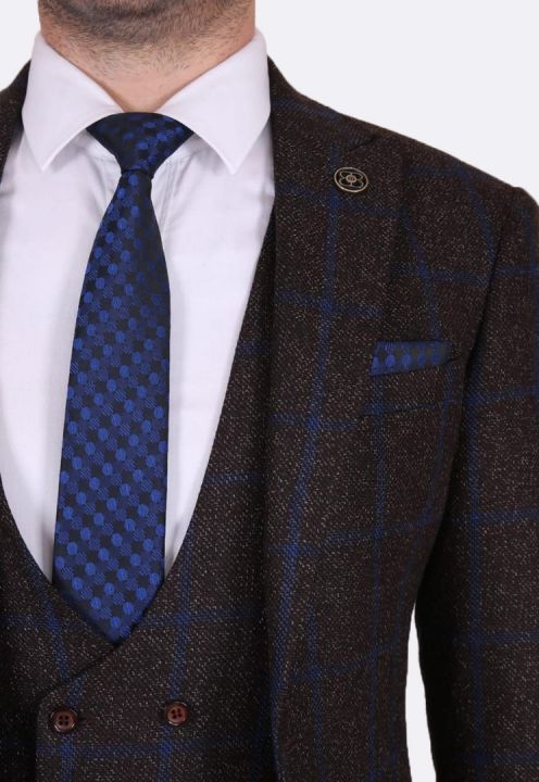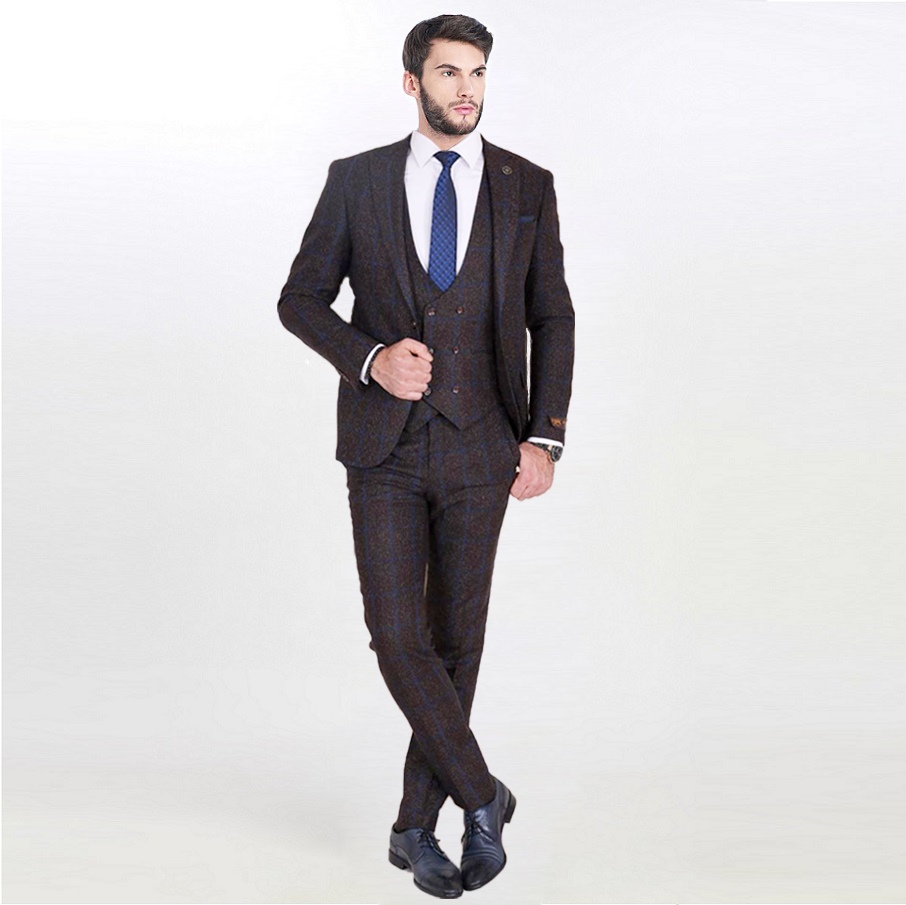 Твидовый костюм-тройка коричневого цвета в легкую синюю клетку